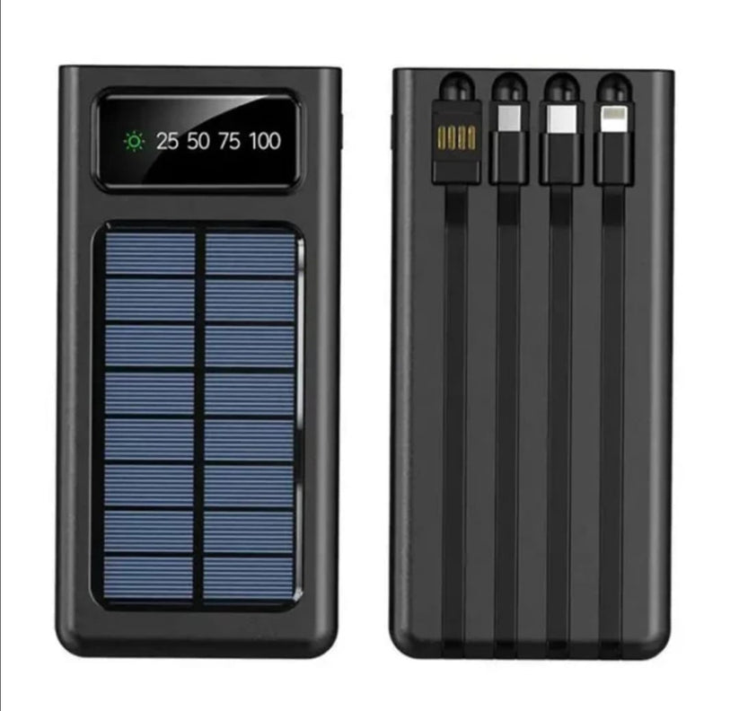 Stay powered anywhere with the 10000mAh Solar Power Bank, your ultimate companion for travel, outdoor adventures, and emergency situations. This compact, all-in-one power bank features 4 built-in charging cables—Lightning, USB-C, Micro USB, and USB-A—so you can charge multiple devices without carrying extra wires.